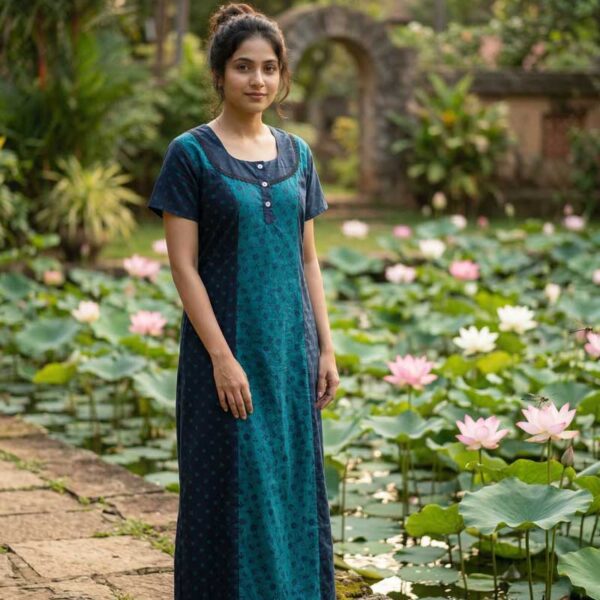 Comfortable Churidar Model Cotton Nighty, 55 Inches Long – Dark Blue + Green