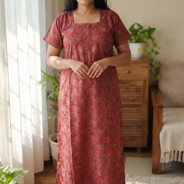 Comfortable Front Open Cotton Nighty With Buttons – 57 Inches long – Chocolate + Maroon
