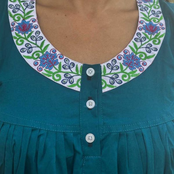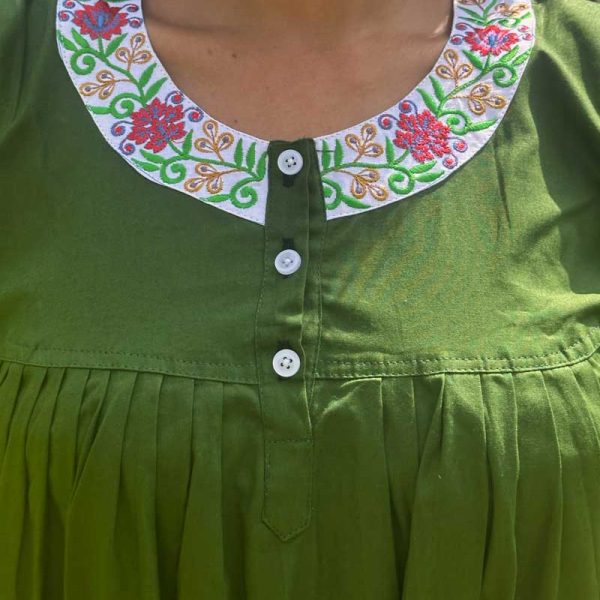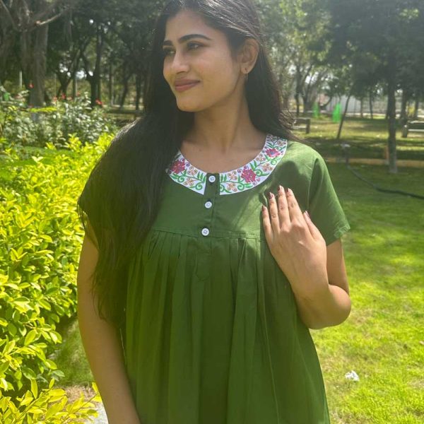 Front Open Poplin Cotton Nighty With Embroidary Neck, 55 Inches Long – Green