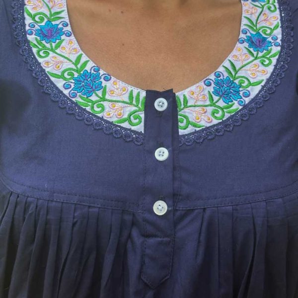 Front Open Poplin Cotton Nighty With Embroidary Neck, 55 Inches Long – Blue