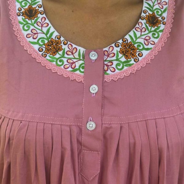 Front Open Poplin Cotton Nighty With Embroidary Neck, 55 Inches Long – Pink