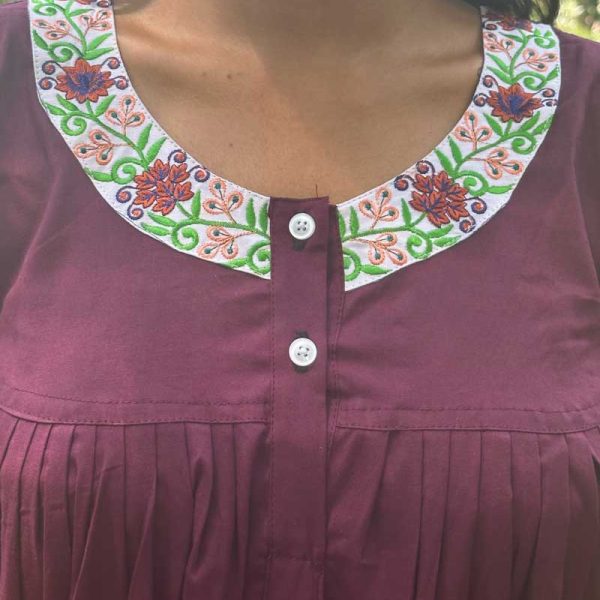 Front Open Poplin Cotton Nighty With Embroidary Neck, 55 Inches Long -Grapes Purple