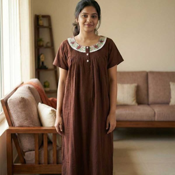 Front Open Cotton Nighty With Embroidary Neck, 55 Inches Long – Coffee Brown