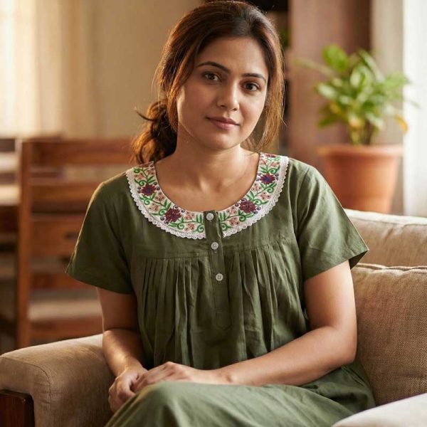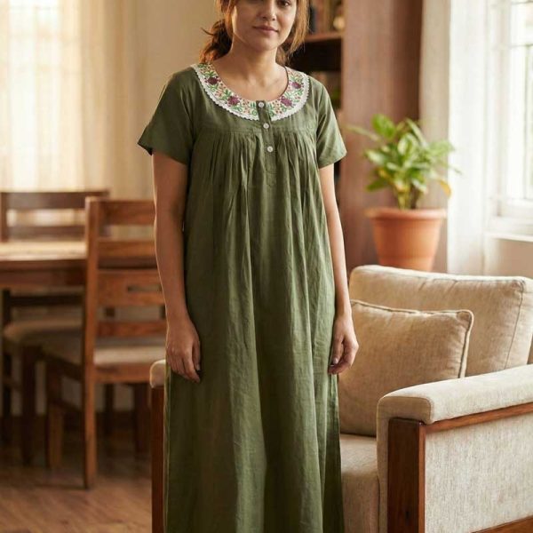 Front Open Cotton Nighty With Embroidary Neck, 55 Inches Long – Pista Green