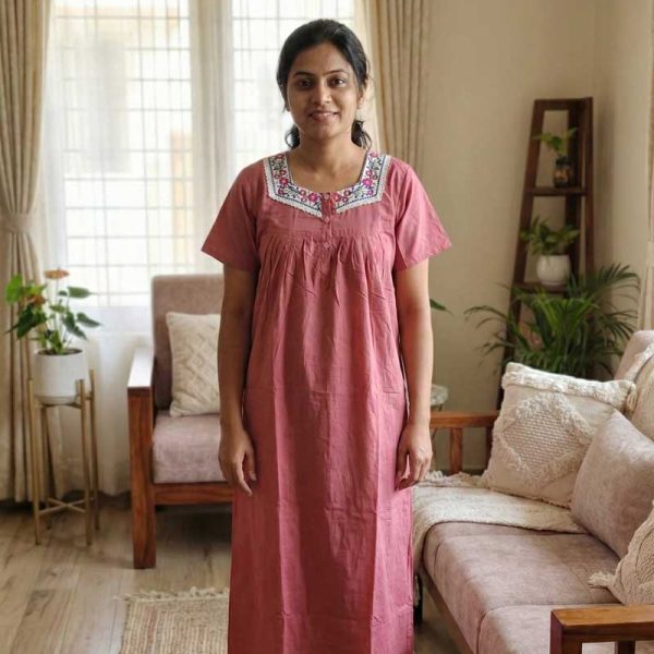 Front Open Cotton Nighty With Embroidary Neck, 55 Inches Long – Onion Pink