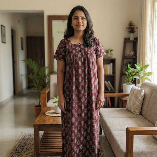 Comfortable Front Open Cotton Nighty With Buttons, Hakoba Yoke, 3/4th Sleeves – 55 inches long – Maroon