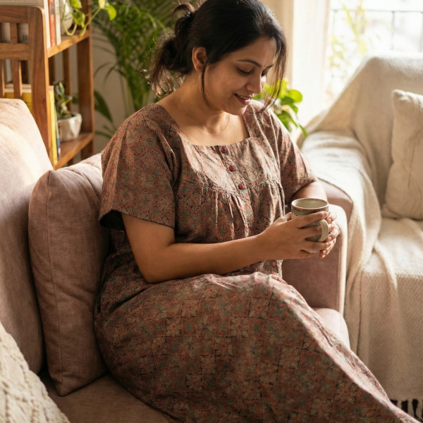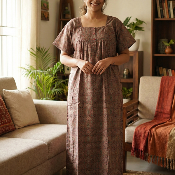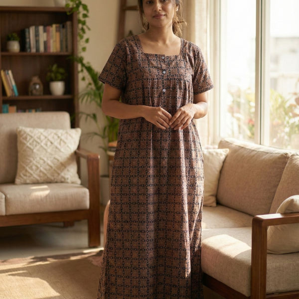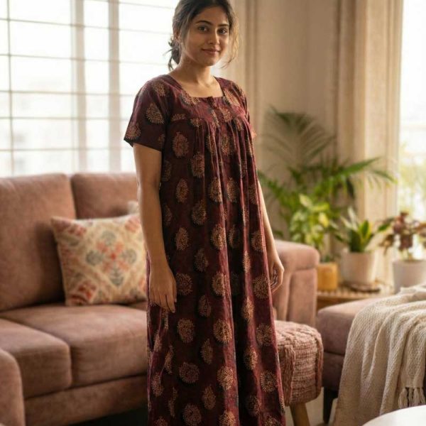Front open Ajrak cotton nighty, 55 Inches Long – Maroon