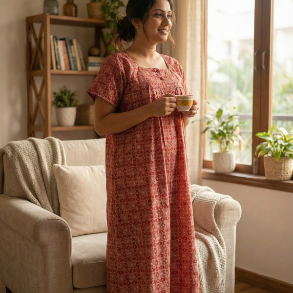 Comfortable Front Open Cotton Nighty With Buttons- 57 inches long – Maroon