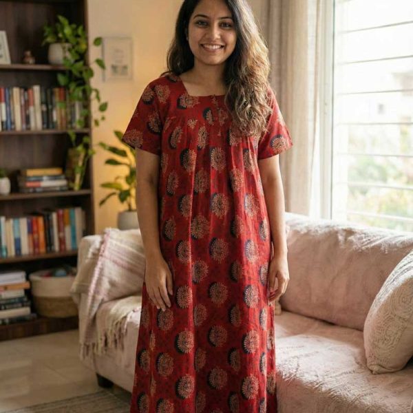 Front open Ajrak cotton nighty, 55 Inches Long – Red