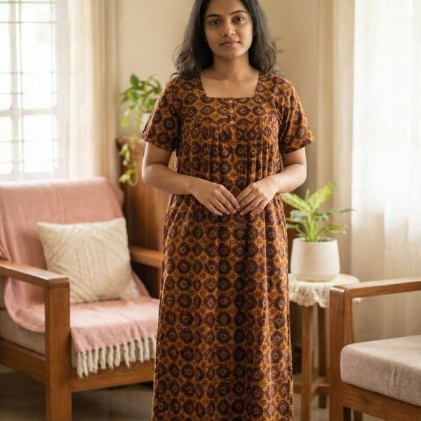 Front Open Cambric Cotton Nighty With Buttons, 55 Inches Long – Yellow + Brown