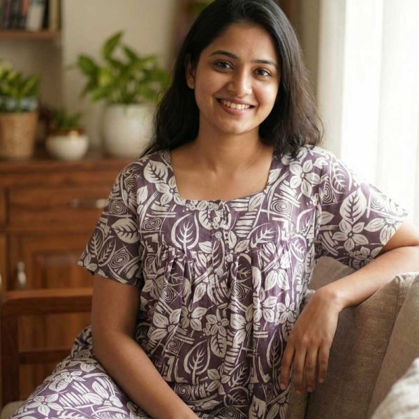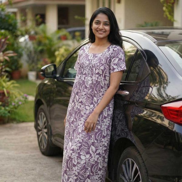 Comfortable Front Open Cotton Nighty With Buttons – 55 inches long – Purple