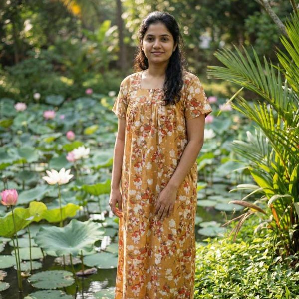 Comfortable Front Open Cotton Nighty With Buttons – 55 inches long – Orange