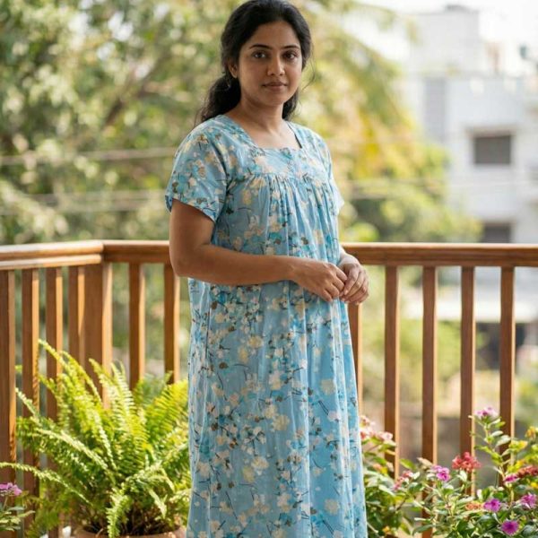 Comfortable Front Open Cotton Nighty With Buttons – 55 inches long – Blue