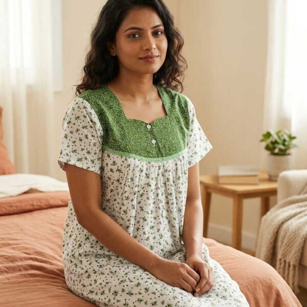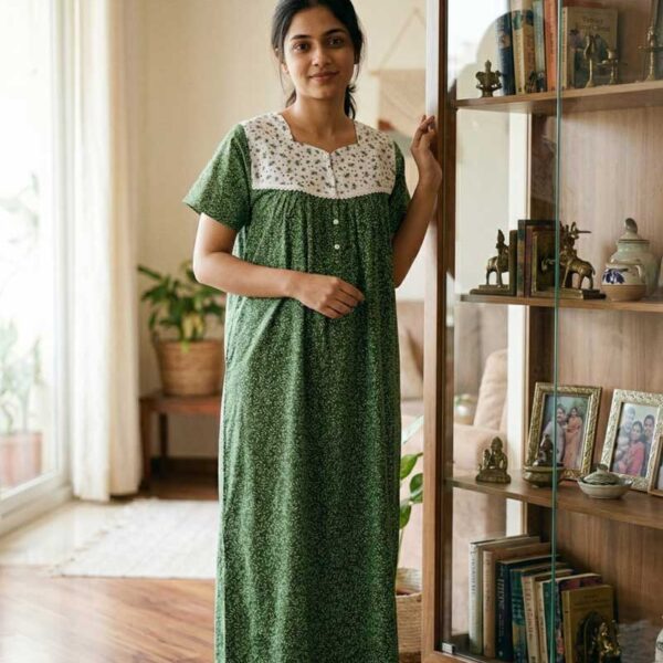 Comfortable Front Open Cotton Nighty With Buttons- 57 inches long – Green