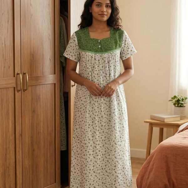 Front Open Cotton Nighty With Buttons, 55 Inches – White + Green