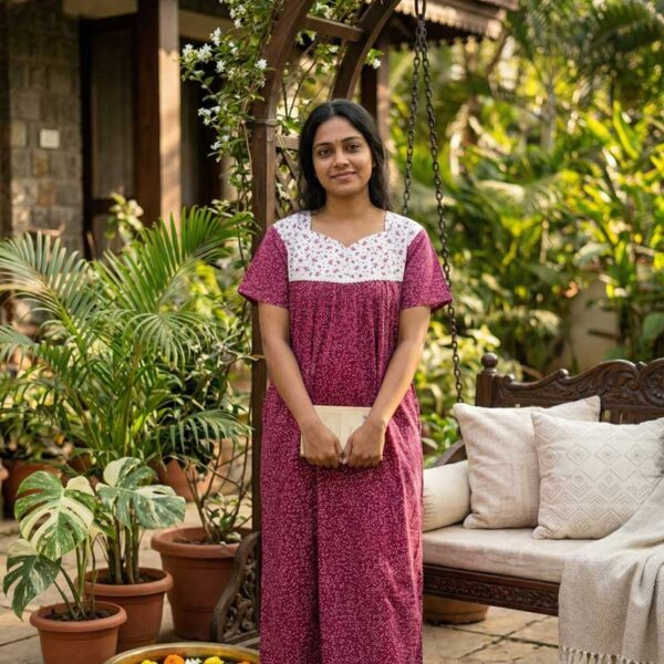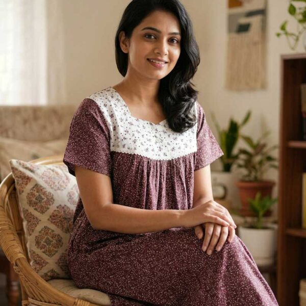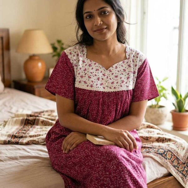 Comfortable Front Open Cotton Nighty With Buttons- 57 inches long – Maroon