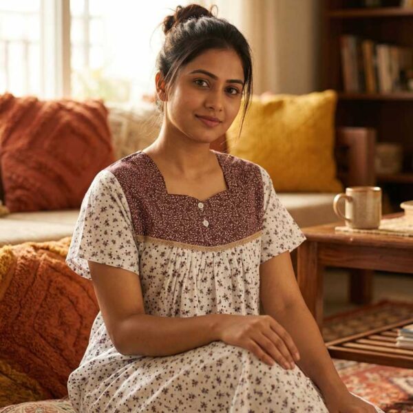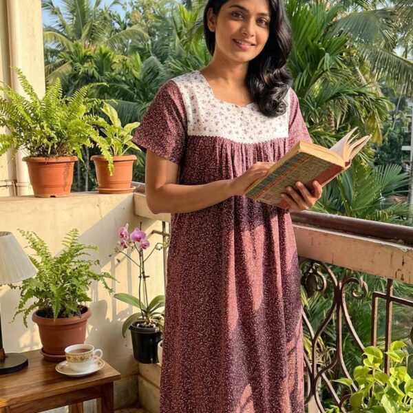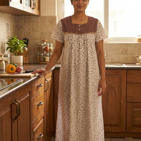 Front Open Cotton Nighty With Buttons, 55 Inches – Brown + White