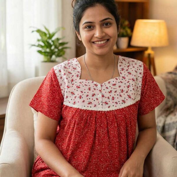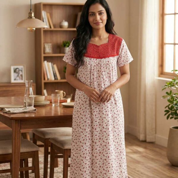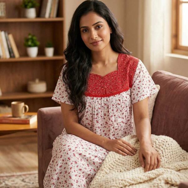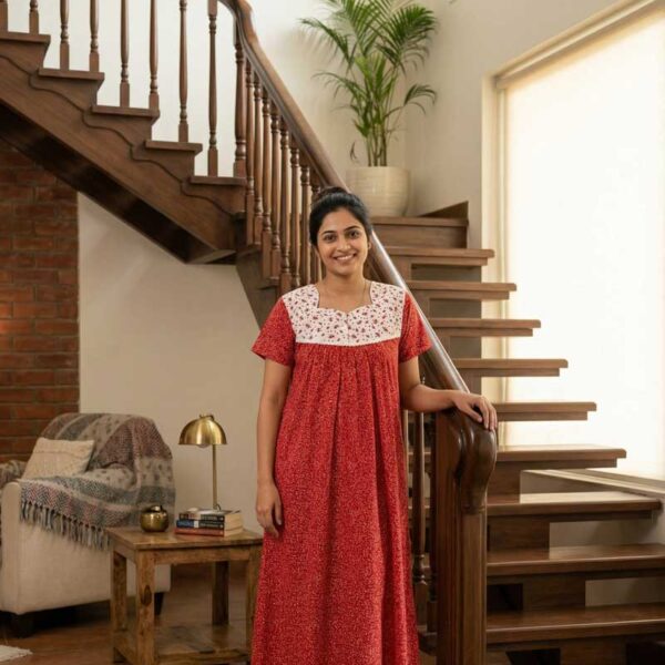 Front Open Cotton Nighty With Buttons, 55 Inches – Red + White