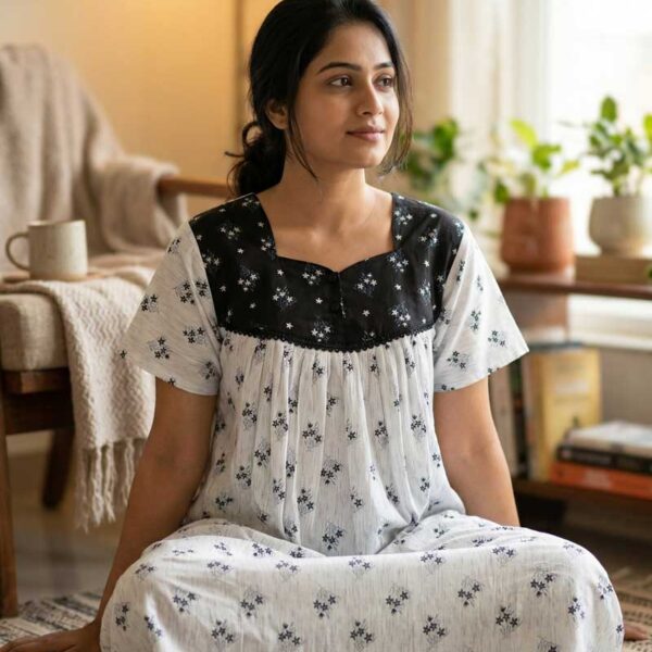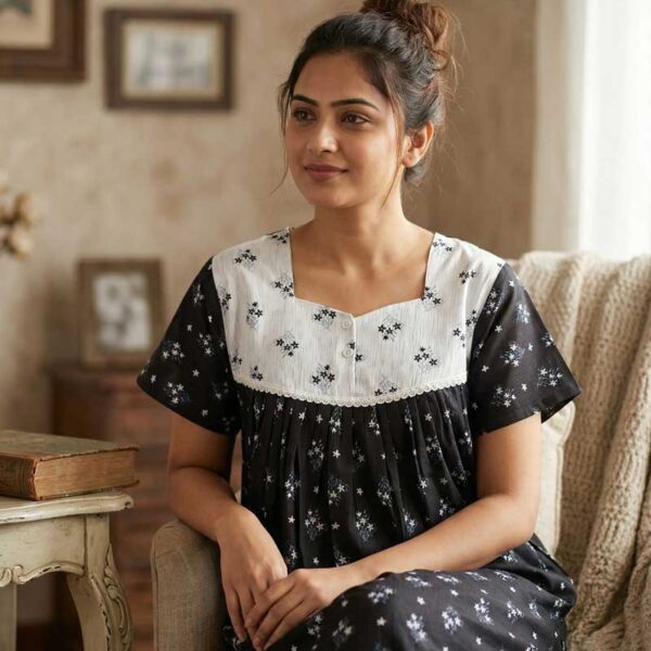 Front Open Cotton Nighty With Buttons, 55 Inches – Black + White