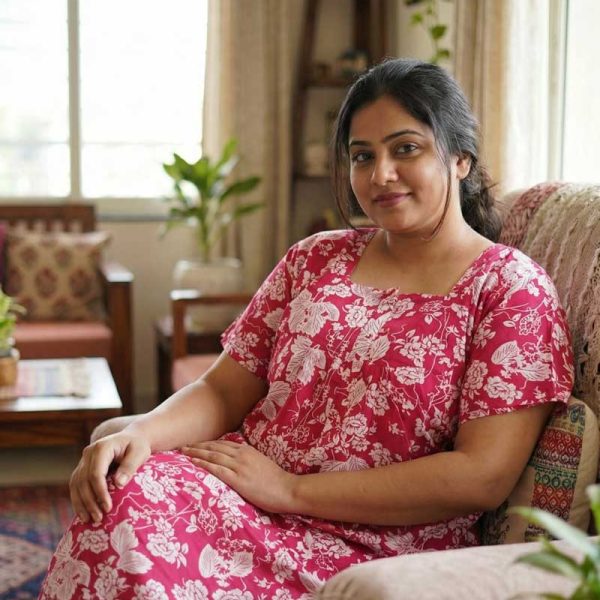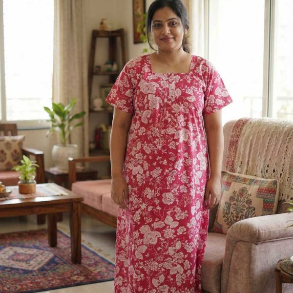 Front Open Cotton Nighty With Buttons, 55 Inches Long, Square Neck – Maroon