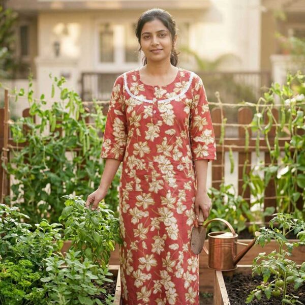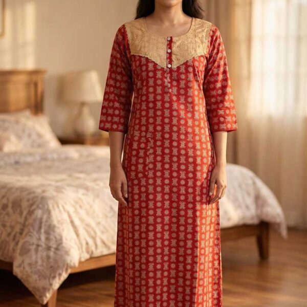 Comfortable Churidar Model Ajrakh Nighty, 55 Inches Long, 3/4th Sleeves, Hacoba Yoke – Red