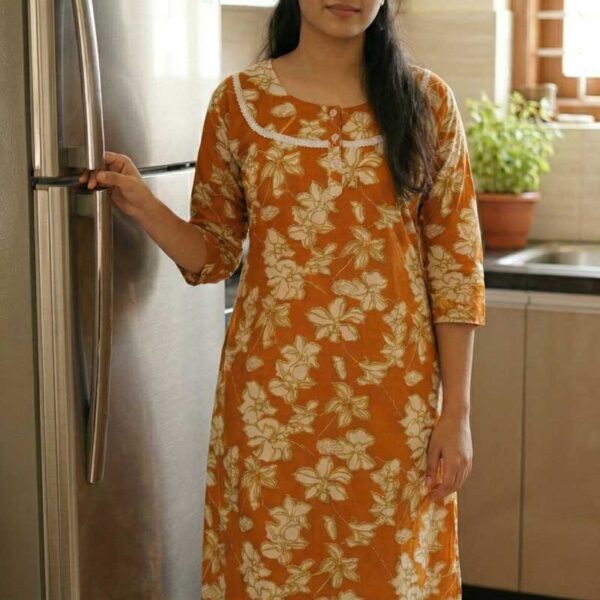 Comfortable Churidar Model Cotton Nighty, 55 Inches Long, 3/4th Sleeves – Orange
