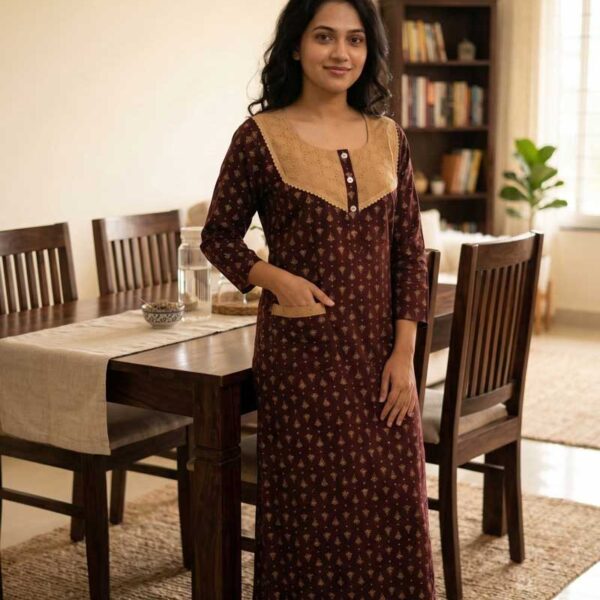 Comfortable Churidar Model Cotton Nighty, 55 Inches Long, 3/4th Sleeves – Brown