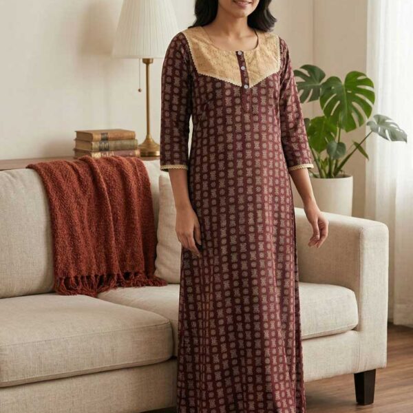 Comfortable Churidar Model Ajrakh Nighty, 55 Inches Long, 3/4th Sleeves, Hacoba Yoke – Maroon