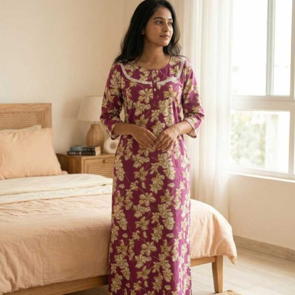 Comfortable Churidar Model Cotton Nighty, 55 Inches Long, 3/4th Sleeves – Purple