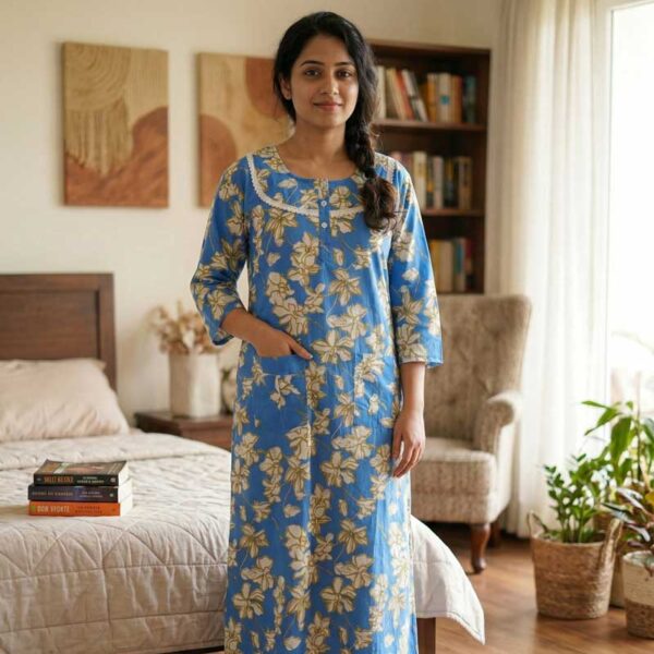 Comfortable Churidar Model Cotton Nighty, 55 Inches Long, 3/4th Sleeves – Blue