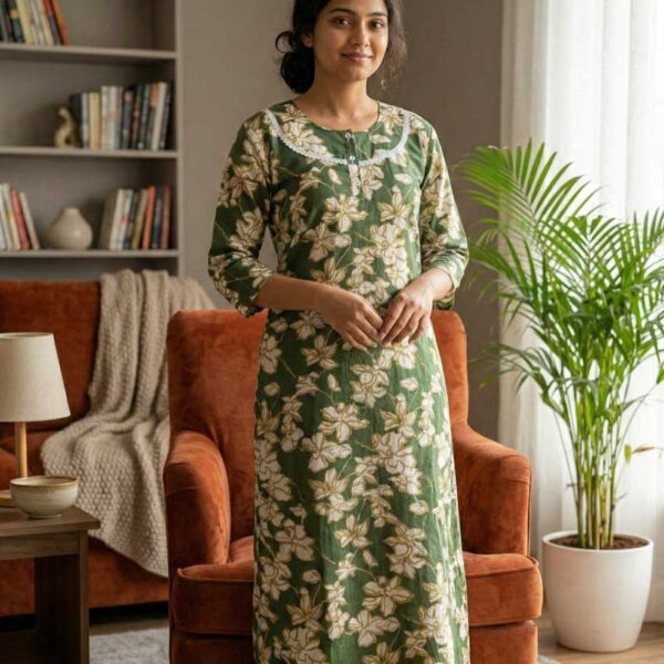 Comfortable Churidar Model Cotton Nighty, 55 Inches Long, 3/4th Sleeves – Green