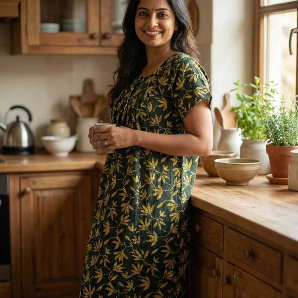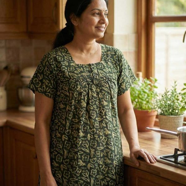 Front Open Cotton Nighty With Buttons, 55 Inches Long – Dark Green