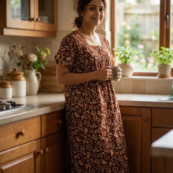 Front Open Cotton Nighty With Buttons, 55 Inches Long – Brown