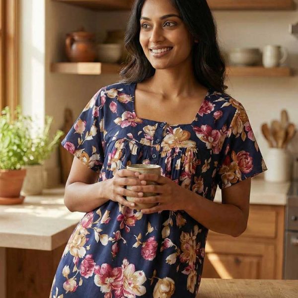 Front Open Cotton Nighty With Buttons, 55 Inches Long – Peach Flowers