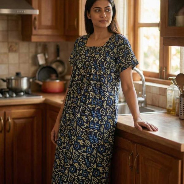 Front Open Cotton Nighty With Buttons, 55 Inches Long – Dark Blue