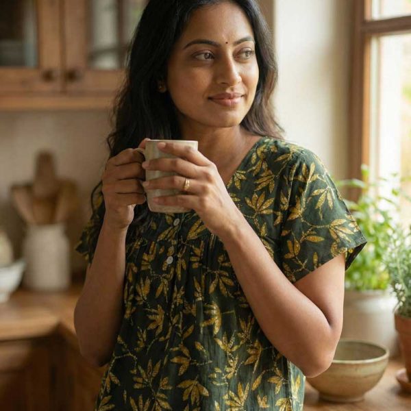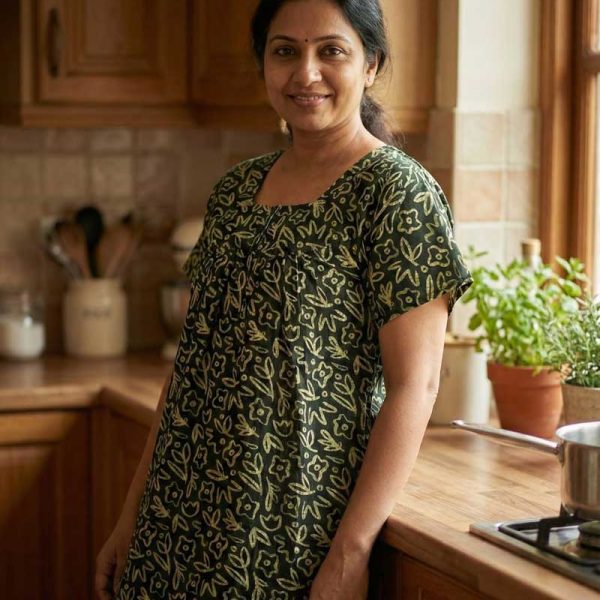 Front Open Cotton Nighty With Buttons, 55 Inches Long – Dark Green