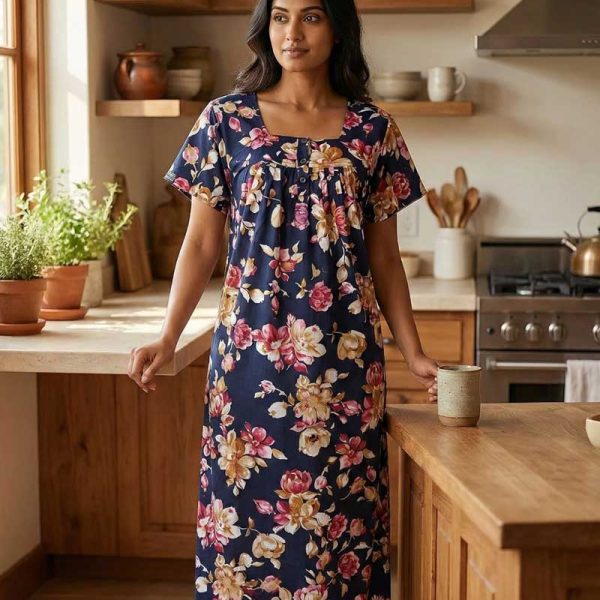 Front Open Cotton Nighty With Buttons, 55 Inches Long – Dark Blue