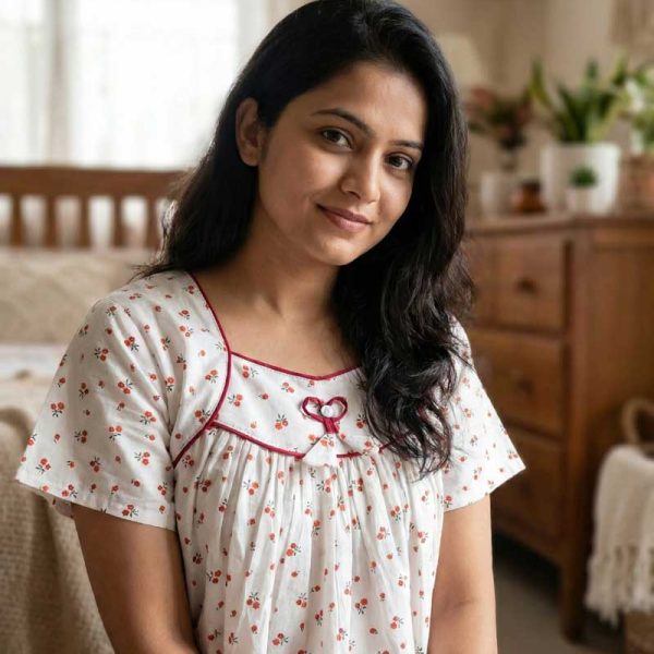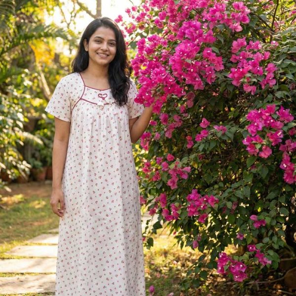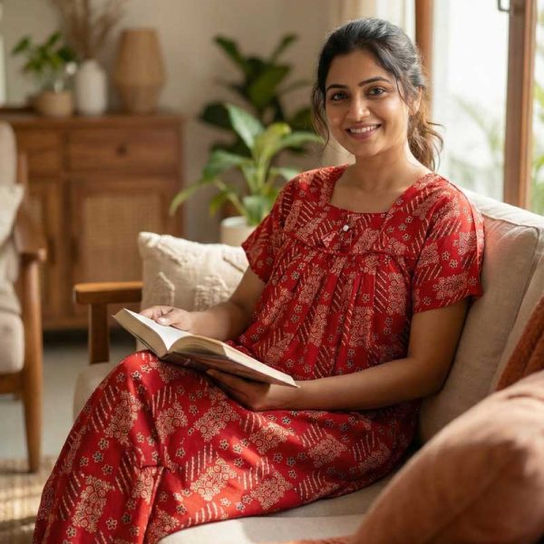 Comfortable Front Open Cotton Nighty With Buttons, Hakoba Yoke, 3/4th Sleeves – 55 inches long – Red