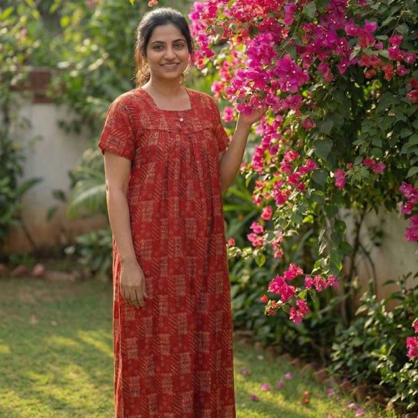 Traditional Ajrakh Nighty, 55 Inches Length – Red