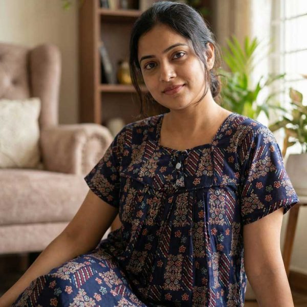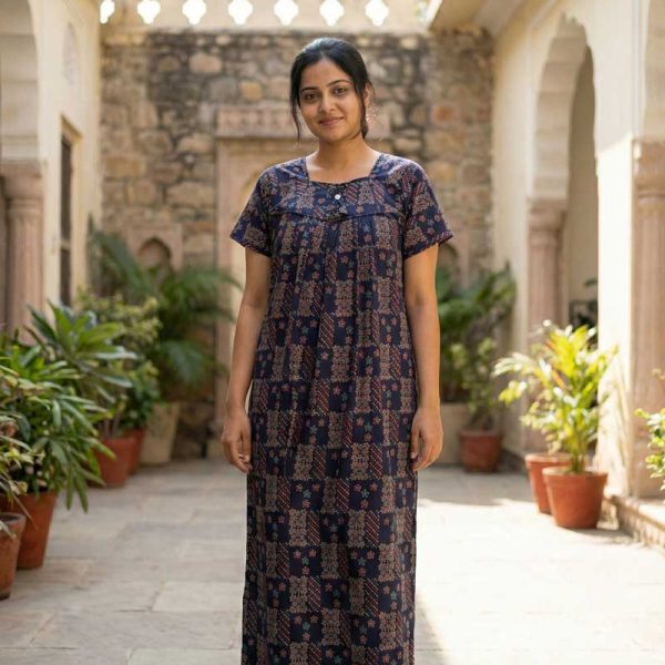 Traditional Ajrakh Nighty, 55 Inches Length – Dark Blue