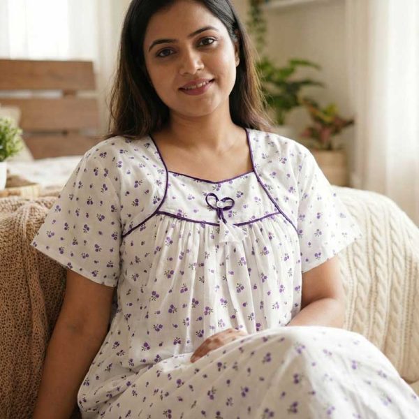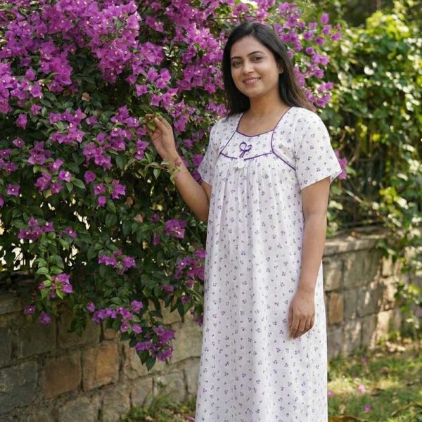 Traditional Cotton Nighty, 55 Inches Length – White + Violet