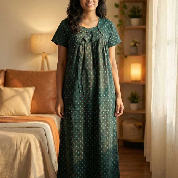 Comfortable Churidar Model Cotton Nighty with Buttons, Hakoba Yoke, 3/4th Sleeves – 55 Inches Long – Maroon